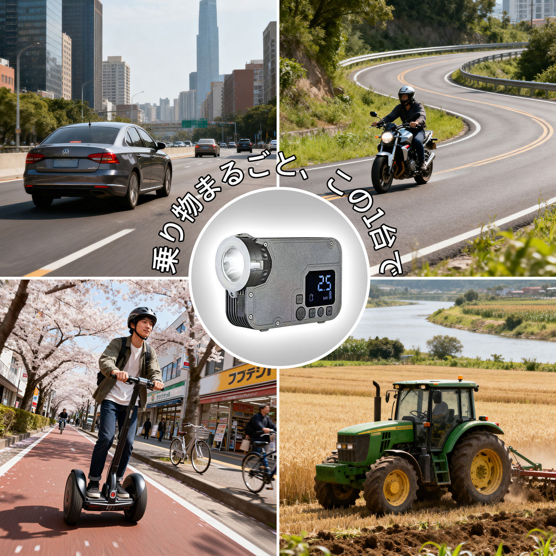 もちろん,12V バッテリー搭載の乗り物なら車以外でも使用可能。バイク・農業機械・モーターボートなど、さまざまなシーンで頼れる1台です。