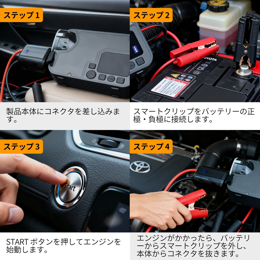ステップ2:スマートクリップをバッテリーの正極・負極に接続します。