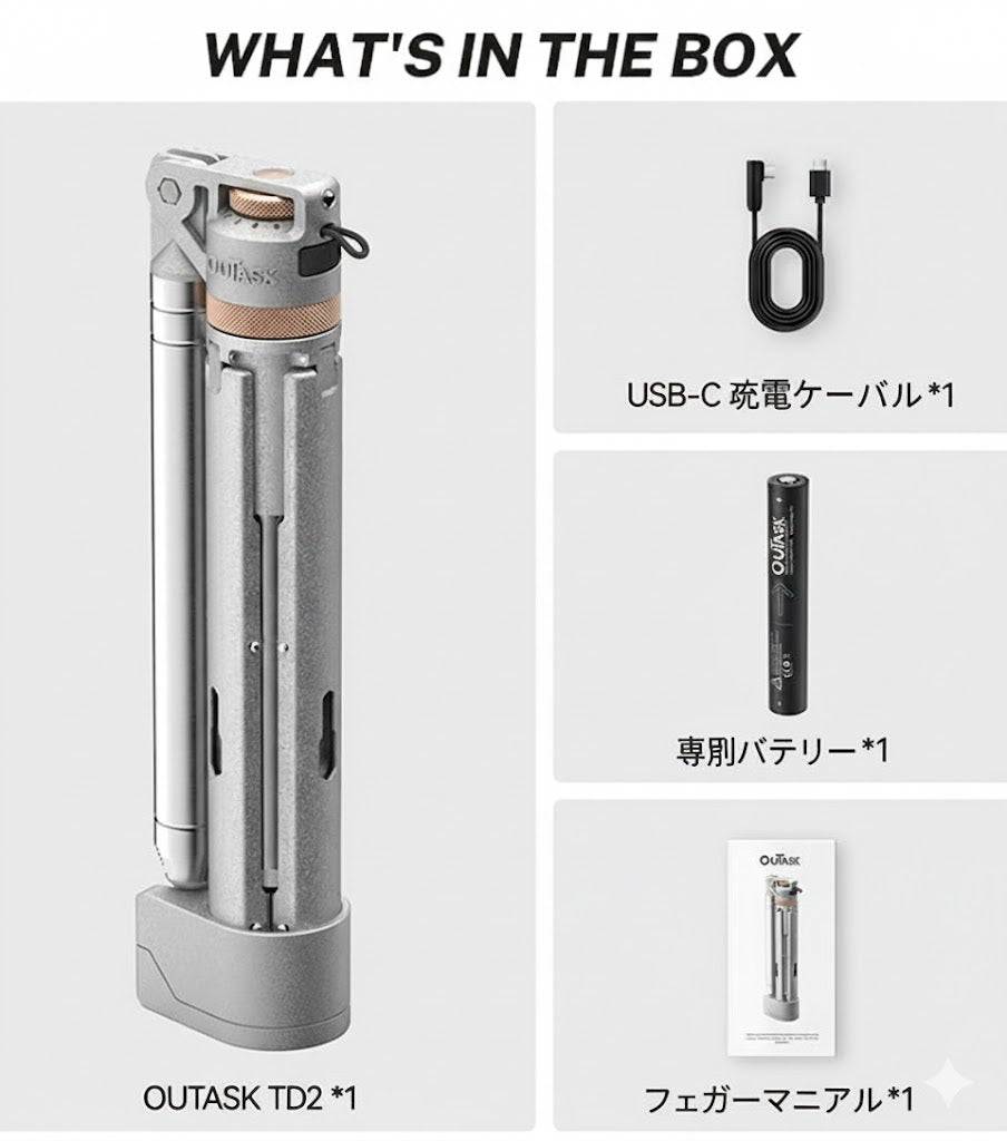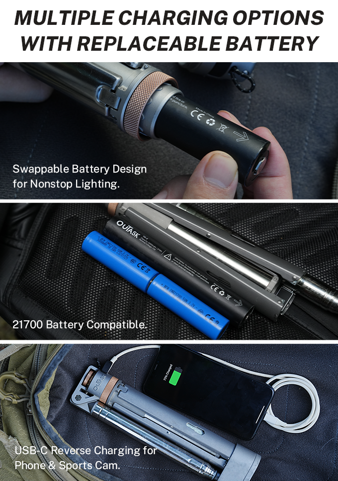 - 交換可能なOuTask TD2専用バッテリー、または2本の21700電池に対応