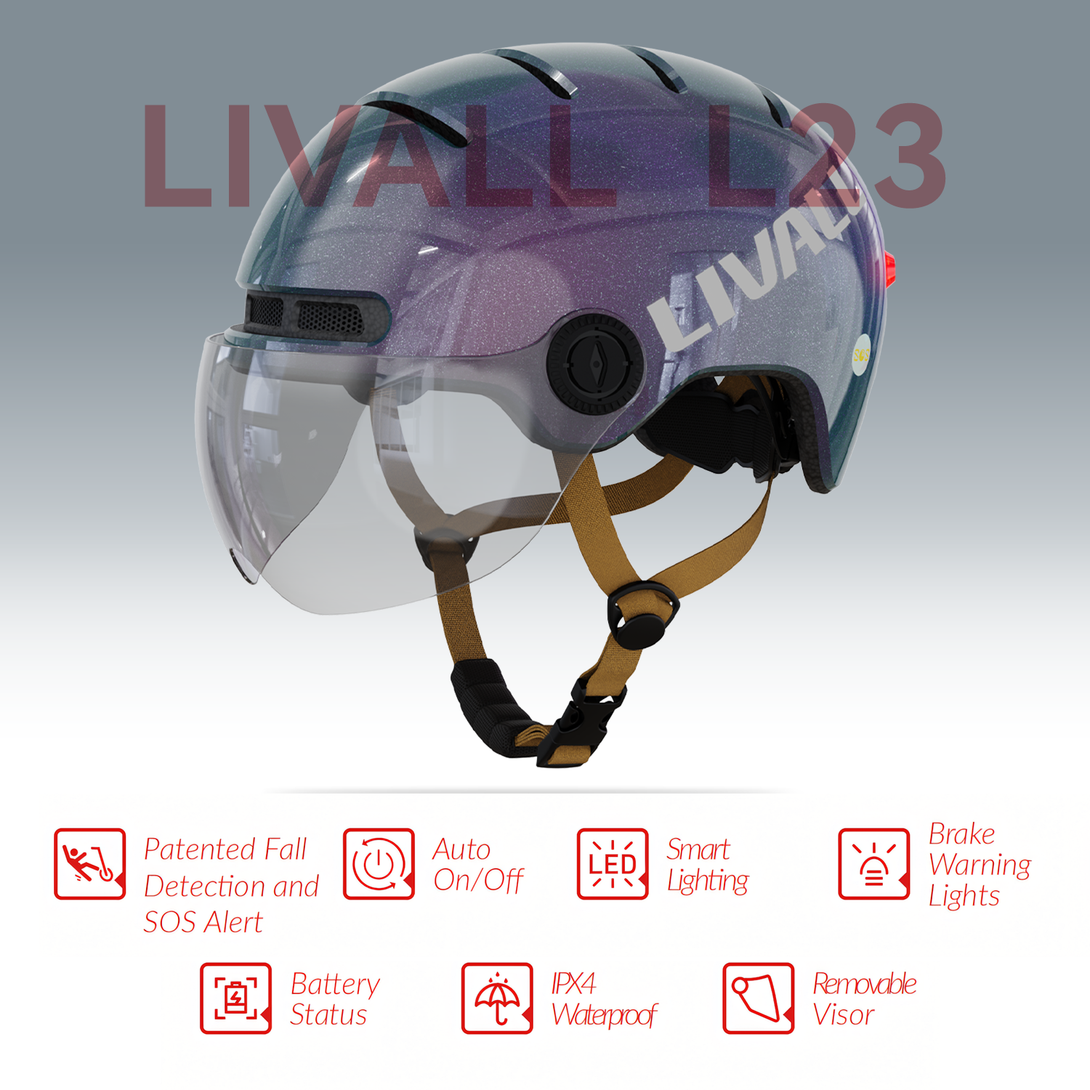 - LIVALL L23 は従来の自転車ヘルメットとは異なり、バイザー付きのスポーツバイクヘルメットで、国際安全基準(NTA 8776、CPSC 1203、EN1078、AS/NZS 2063)に適合し、最高の保護を提供。