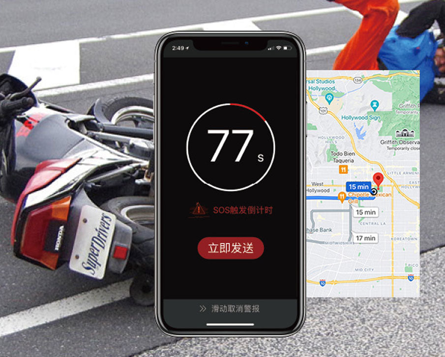 - アウトドアスポーツにおいて初めて特許取得の転倒検知とSOS警報機能を実現。事故が発生した際に転倒を検知し、90秒後にGPS位置情報を含むSMSを設定済み緊急連絡先に自動送信します。